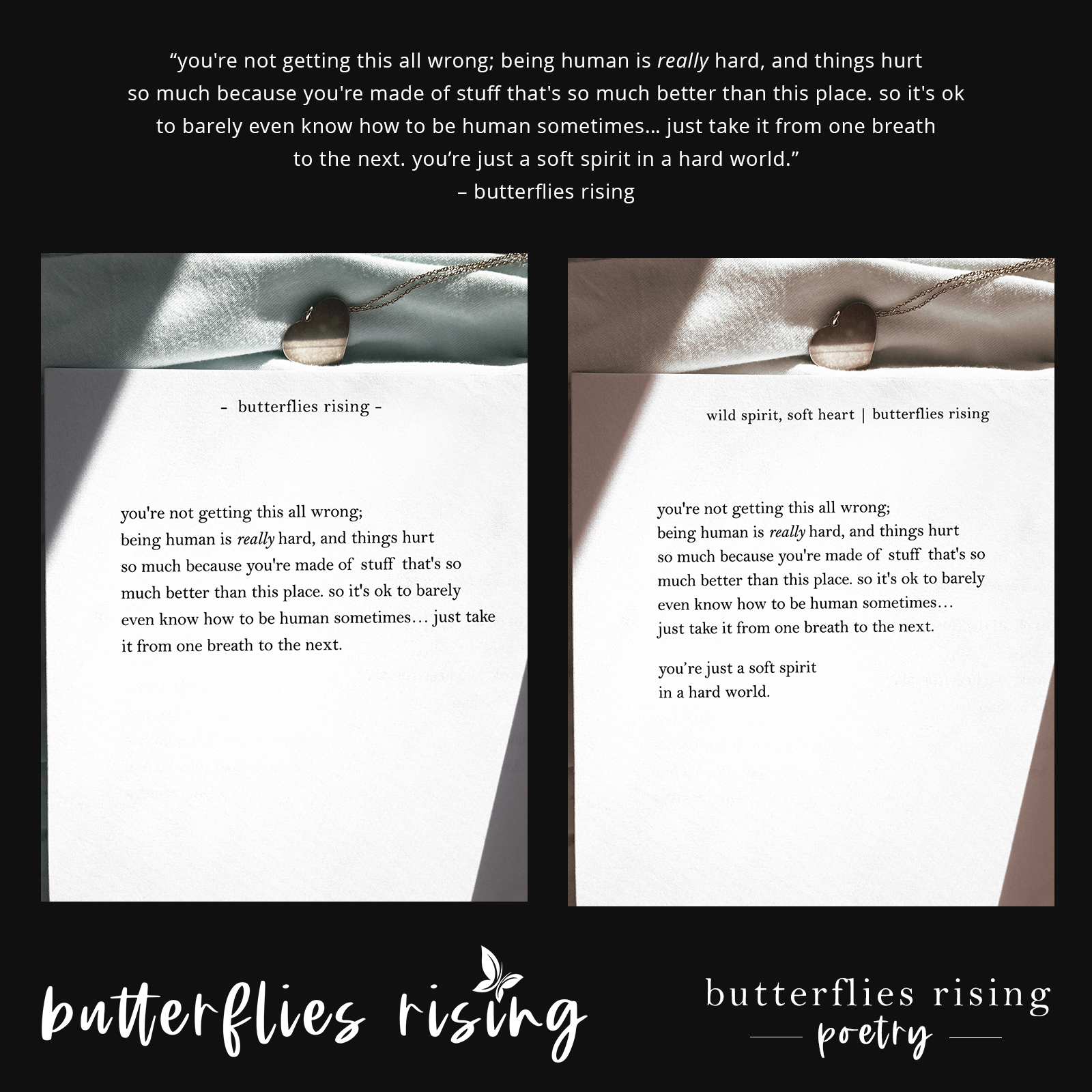 Micropoem and original work by the author butterflies rising that is the full poem to her quote ‘a soft spirit in a hard world‘ that was published on November 6, 2015. A shortened version of the poem was published on September 9, 2024.