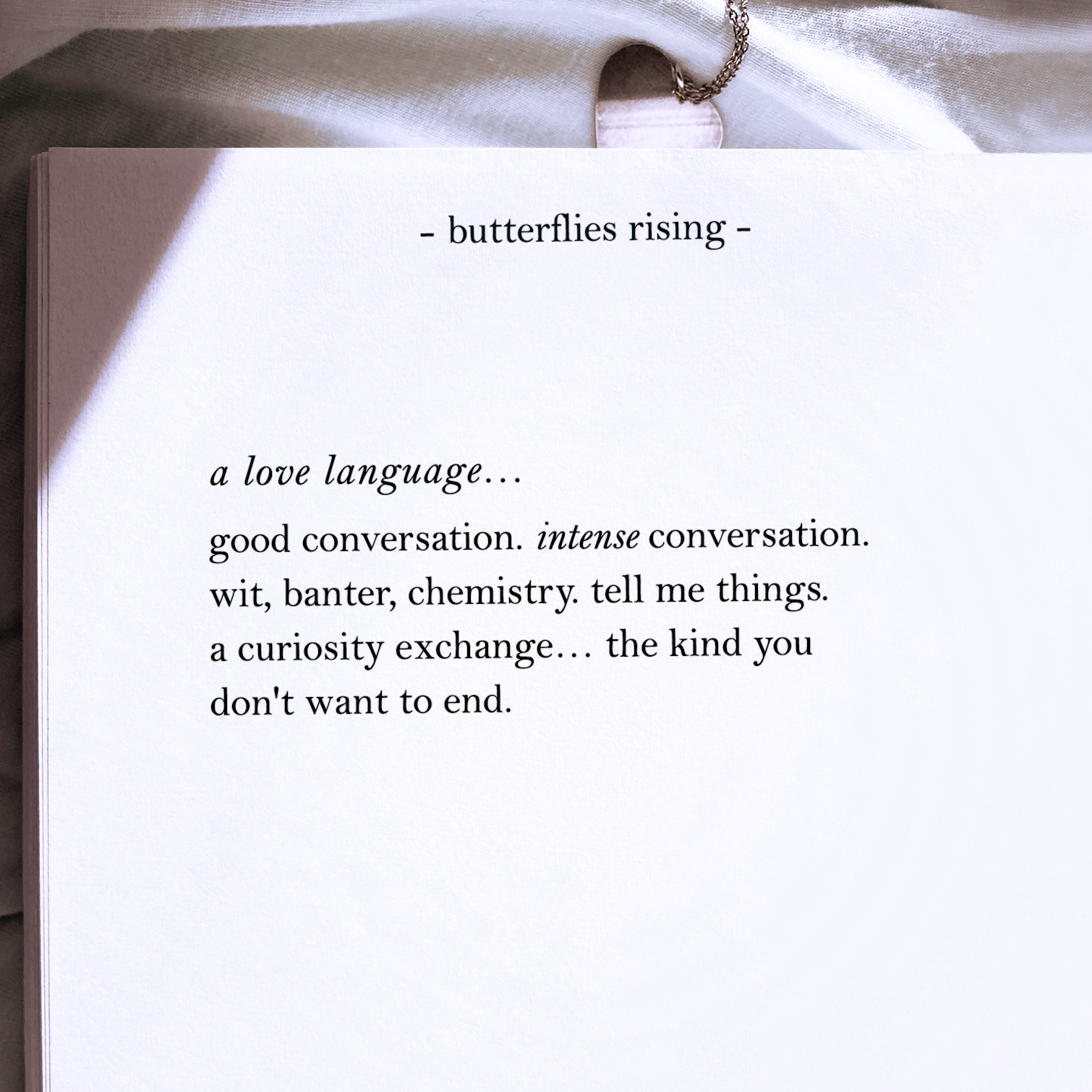 'a love language… good conversation. intense conversation. wit, banter, chemistry' is a poem by the author butterflies rising that was published January 4, 2026.