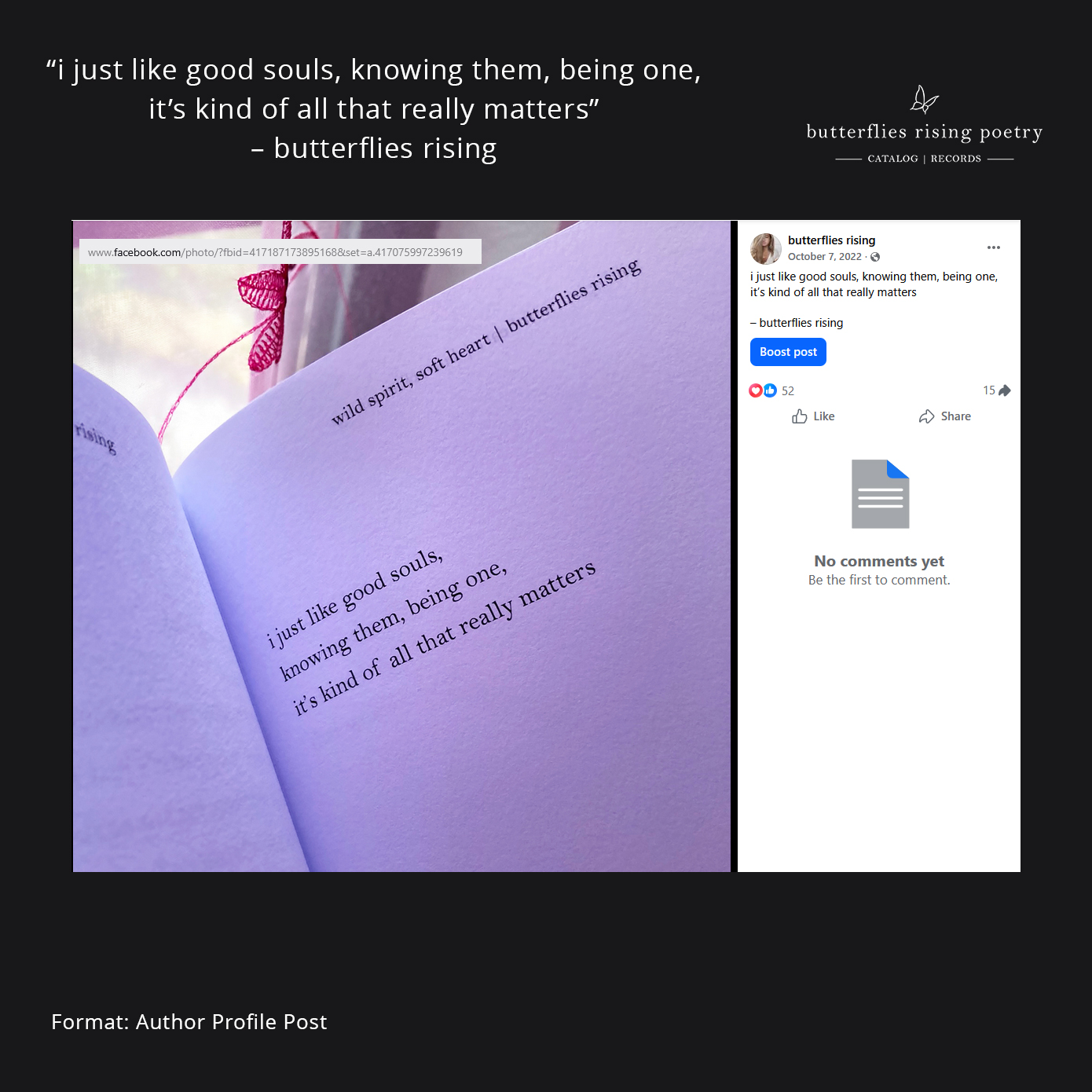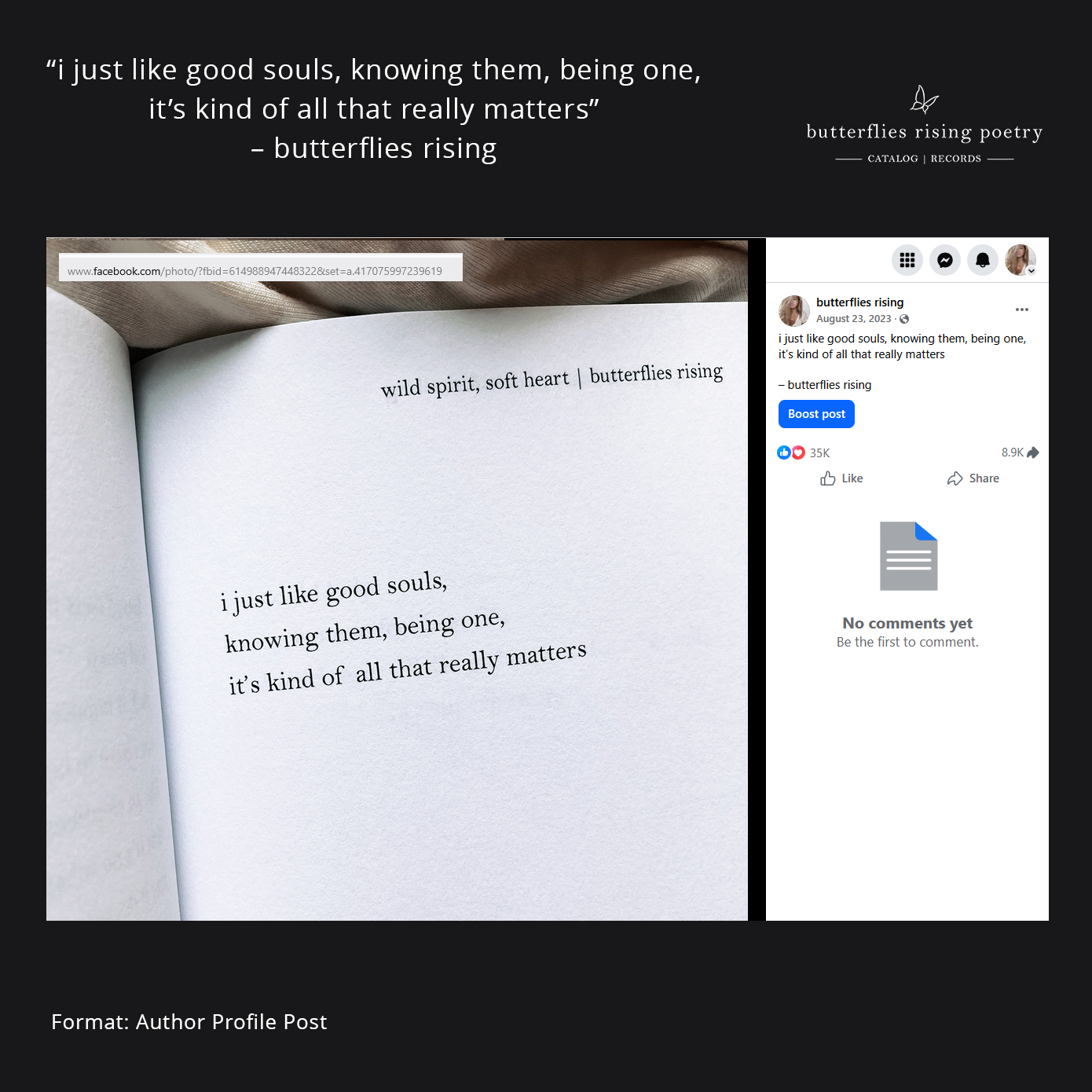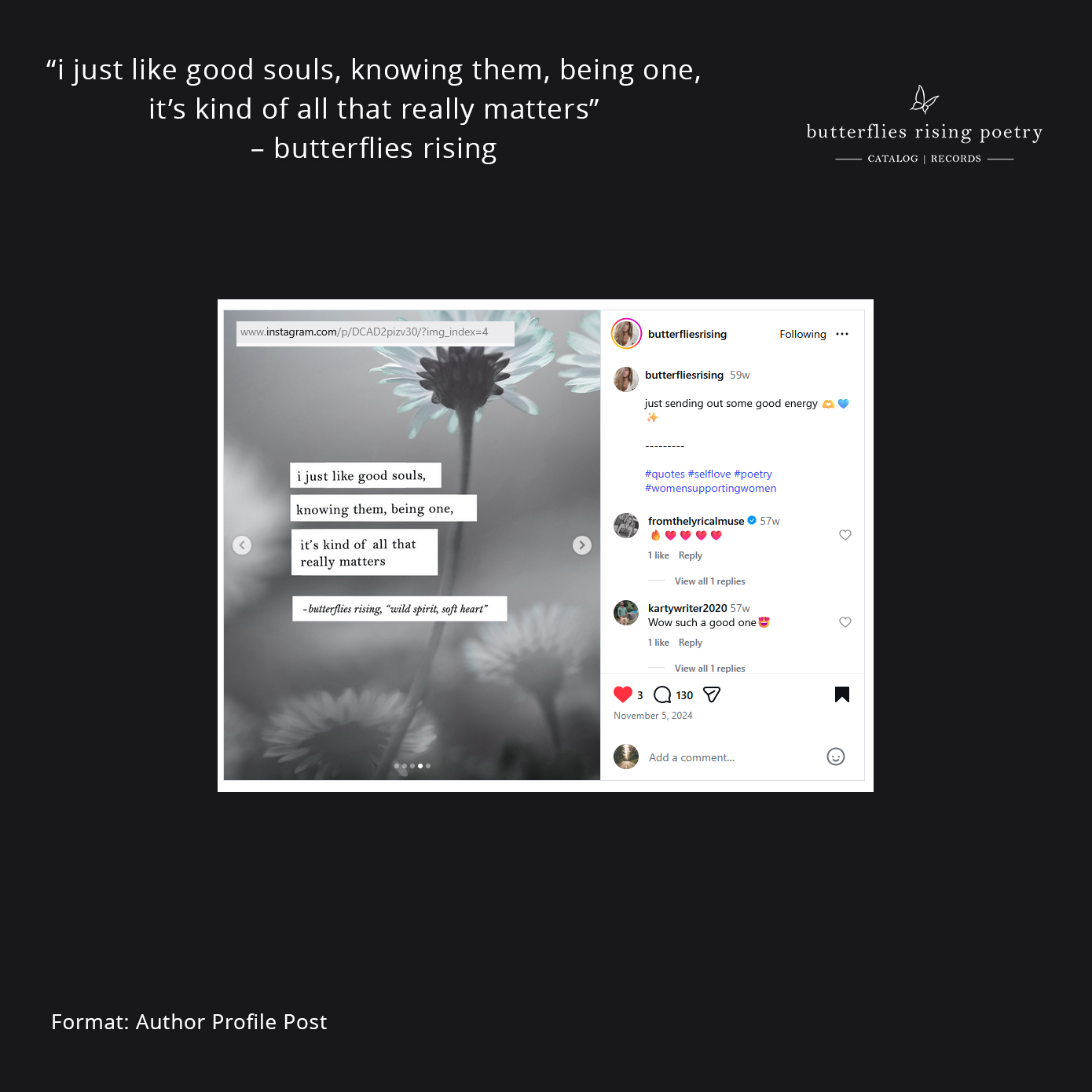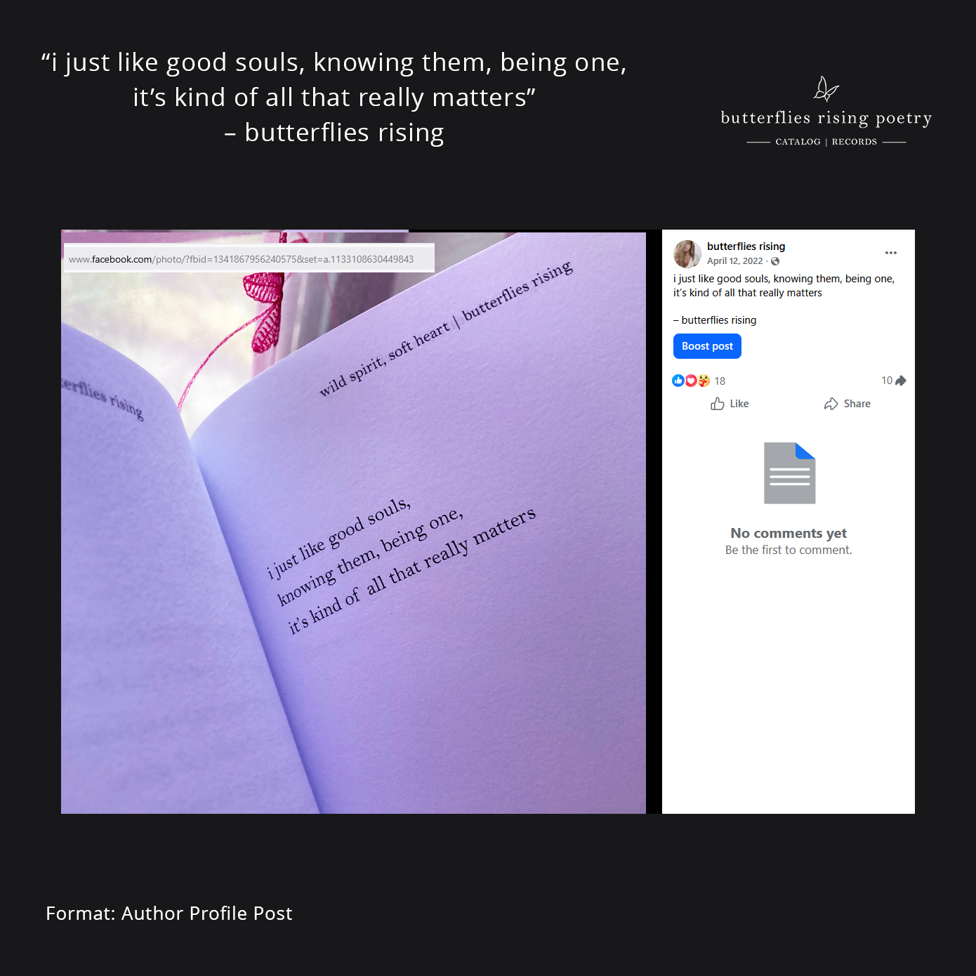 'i just like good souls, knowing them, being one' is a quote by the author butterflies rising that was published publicly on March 10, 2019, and is published in her copyright.gov registered books ‘wild spirit, soft heart’.
