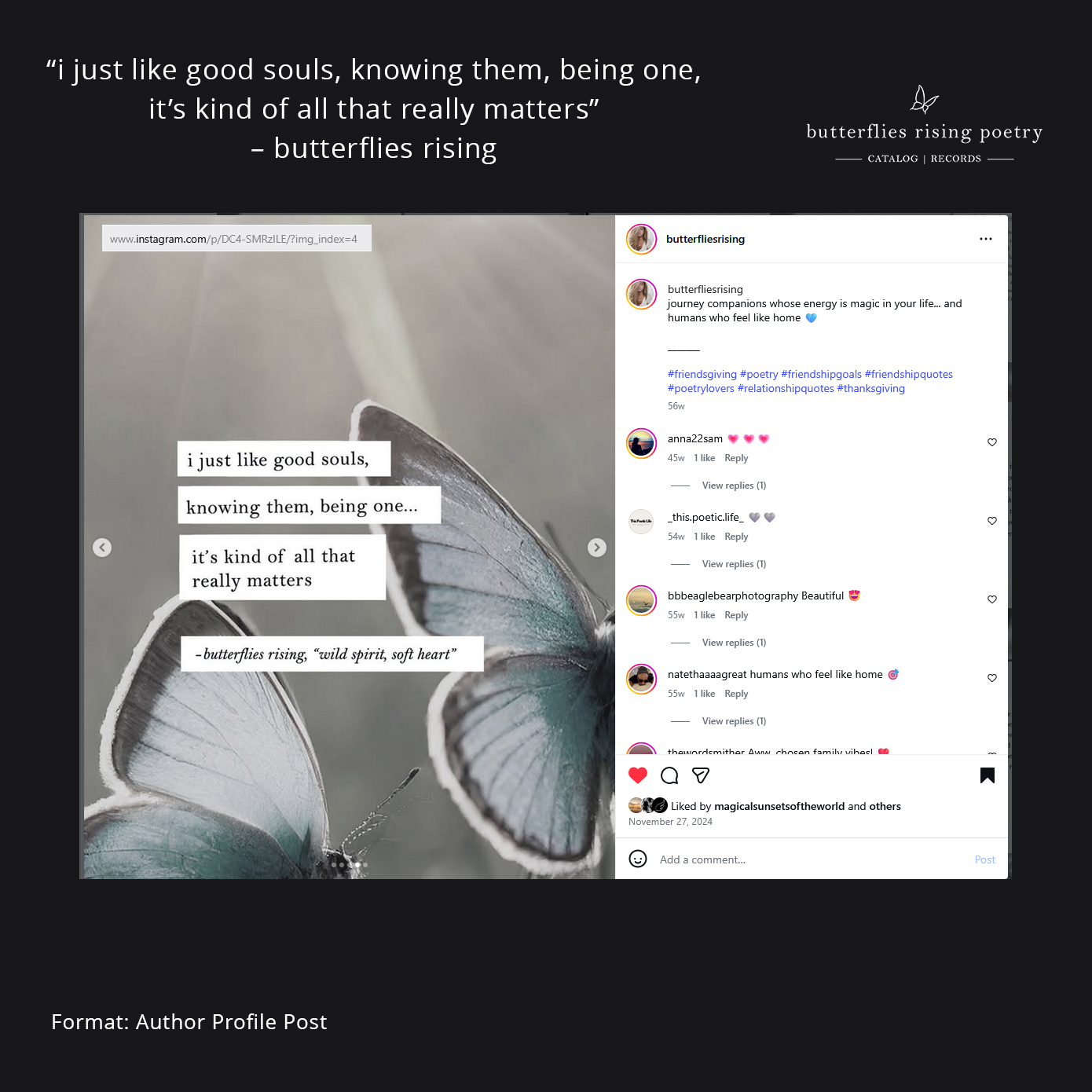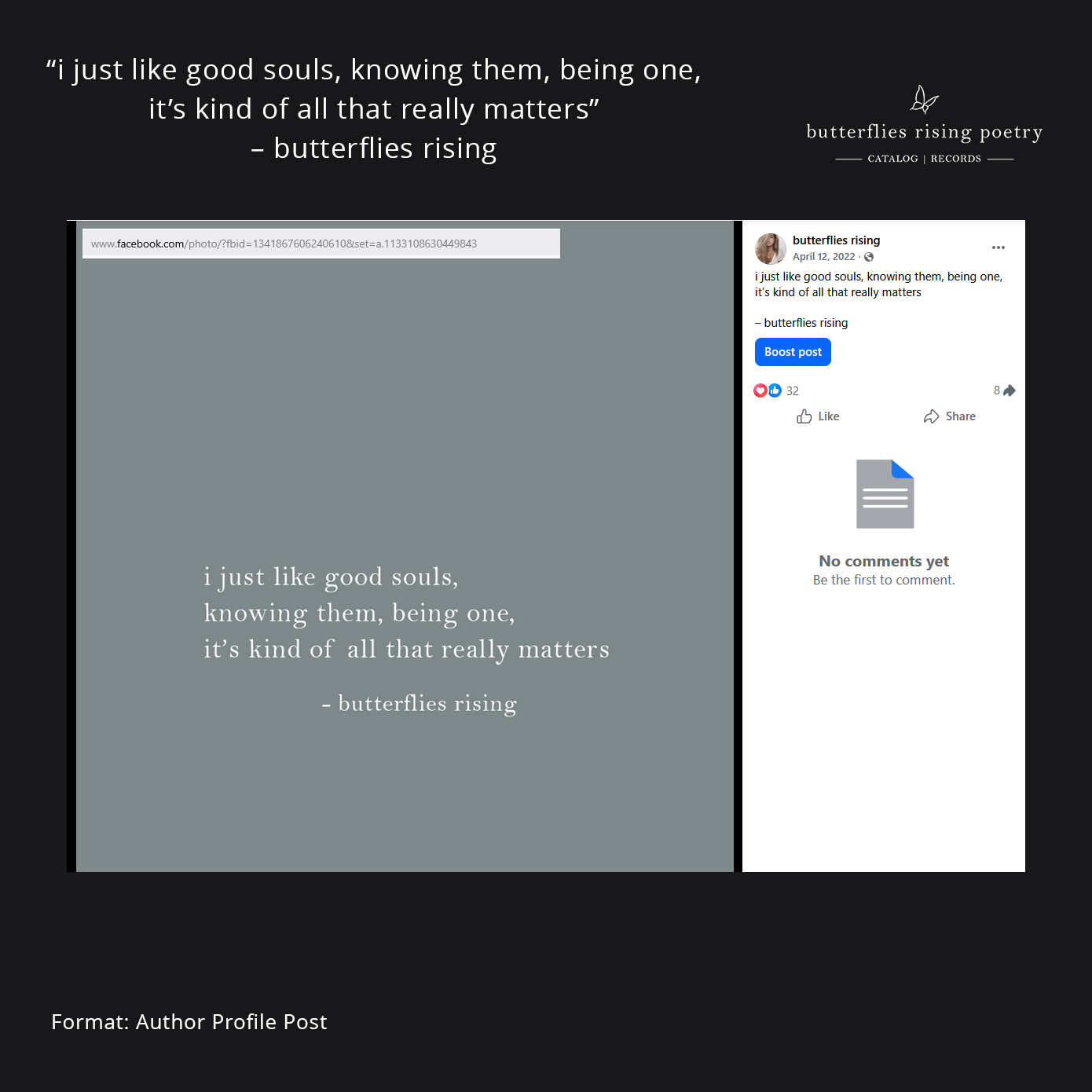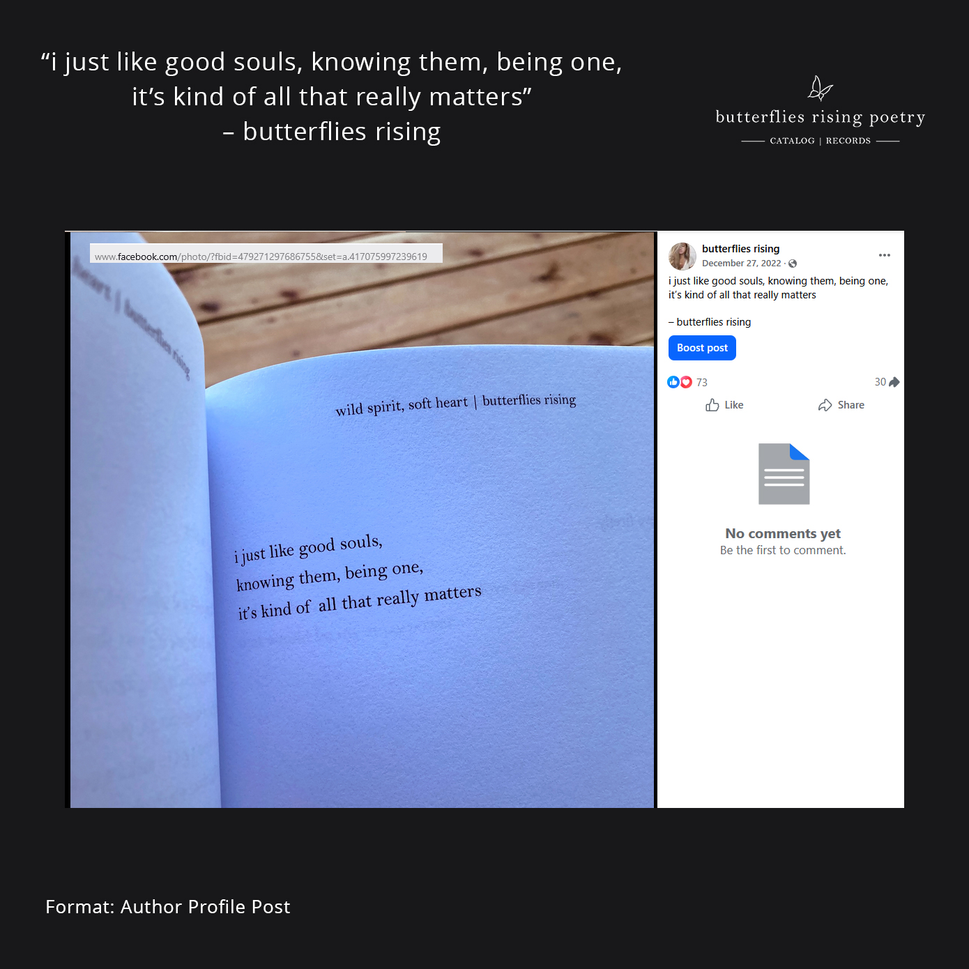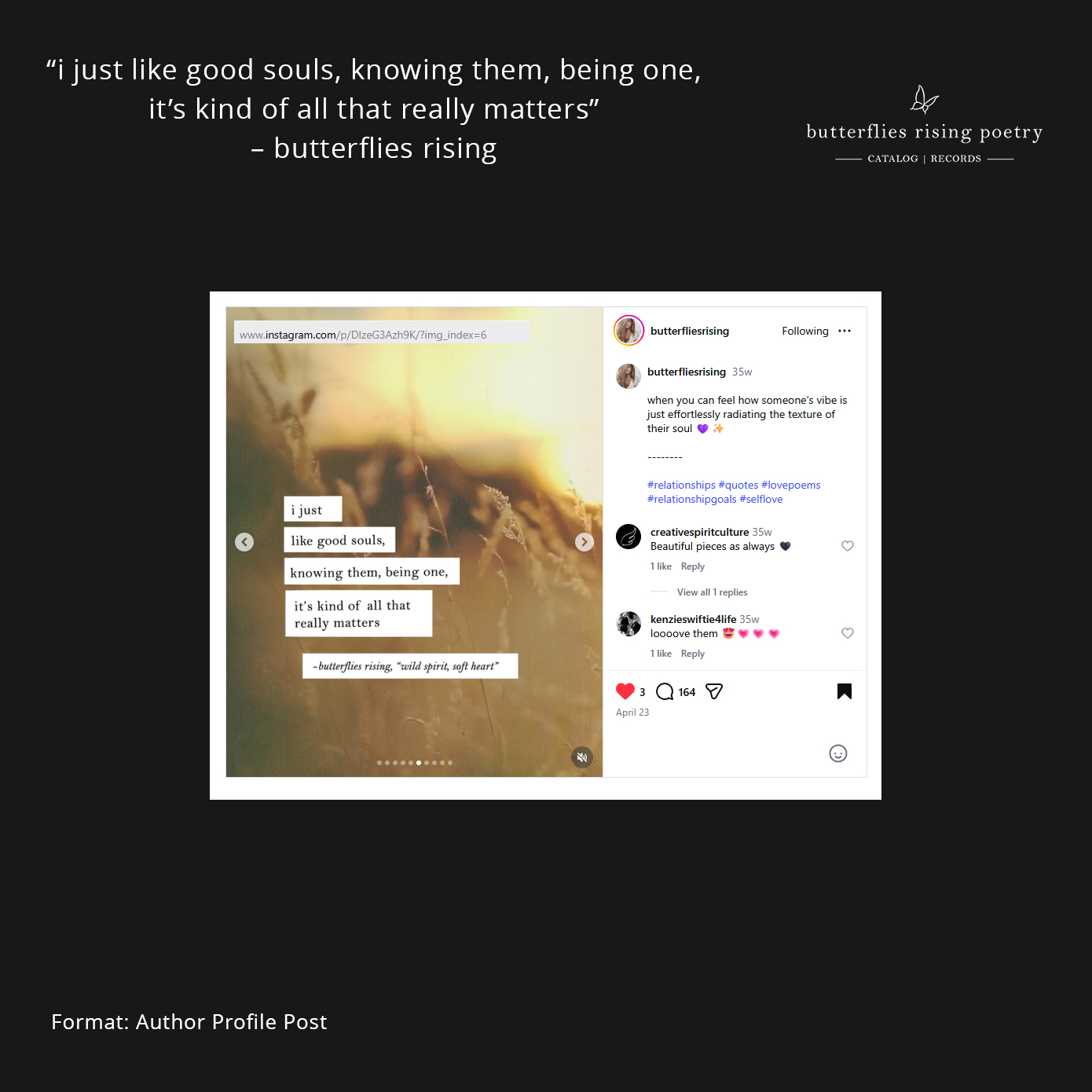'i just like good souls, knowing them, being one' is a quote by the author butterflies rising that was published publicly on March 10, 2019, and is published in her copyright.gov registered books ‘wild spirit, soft heart’.