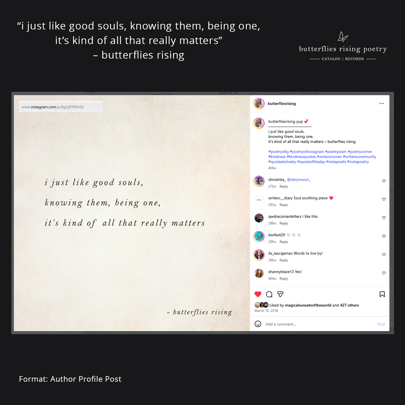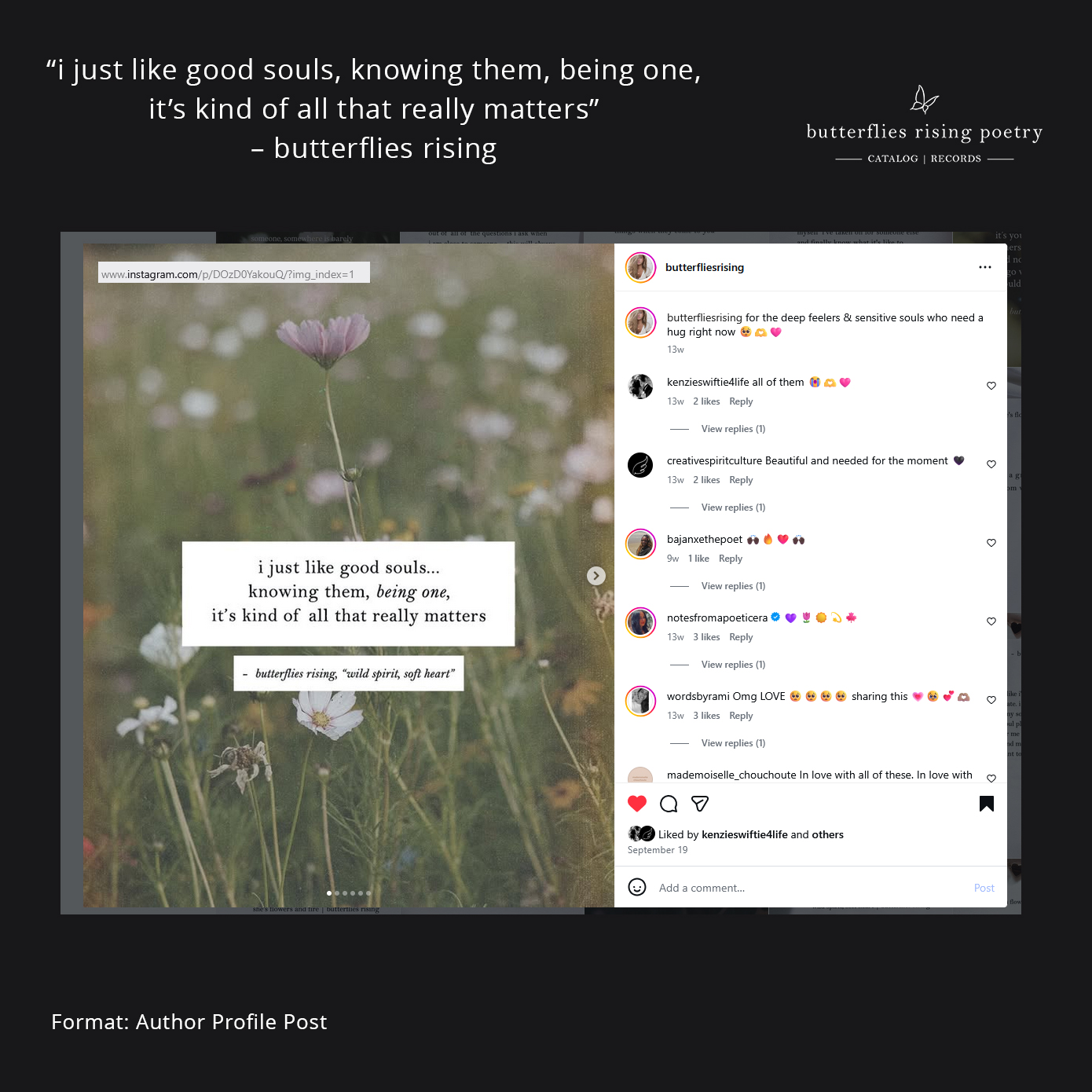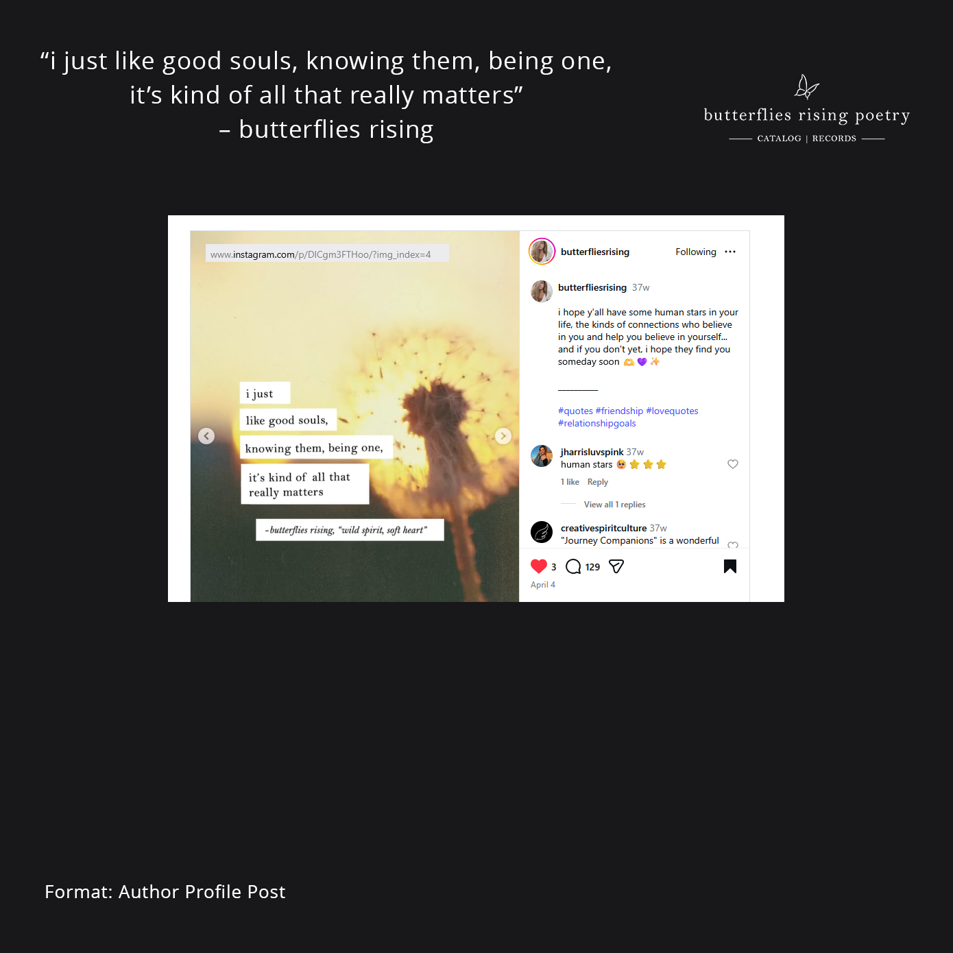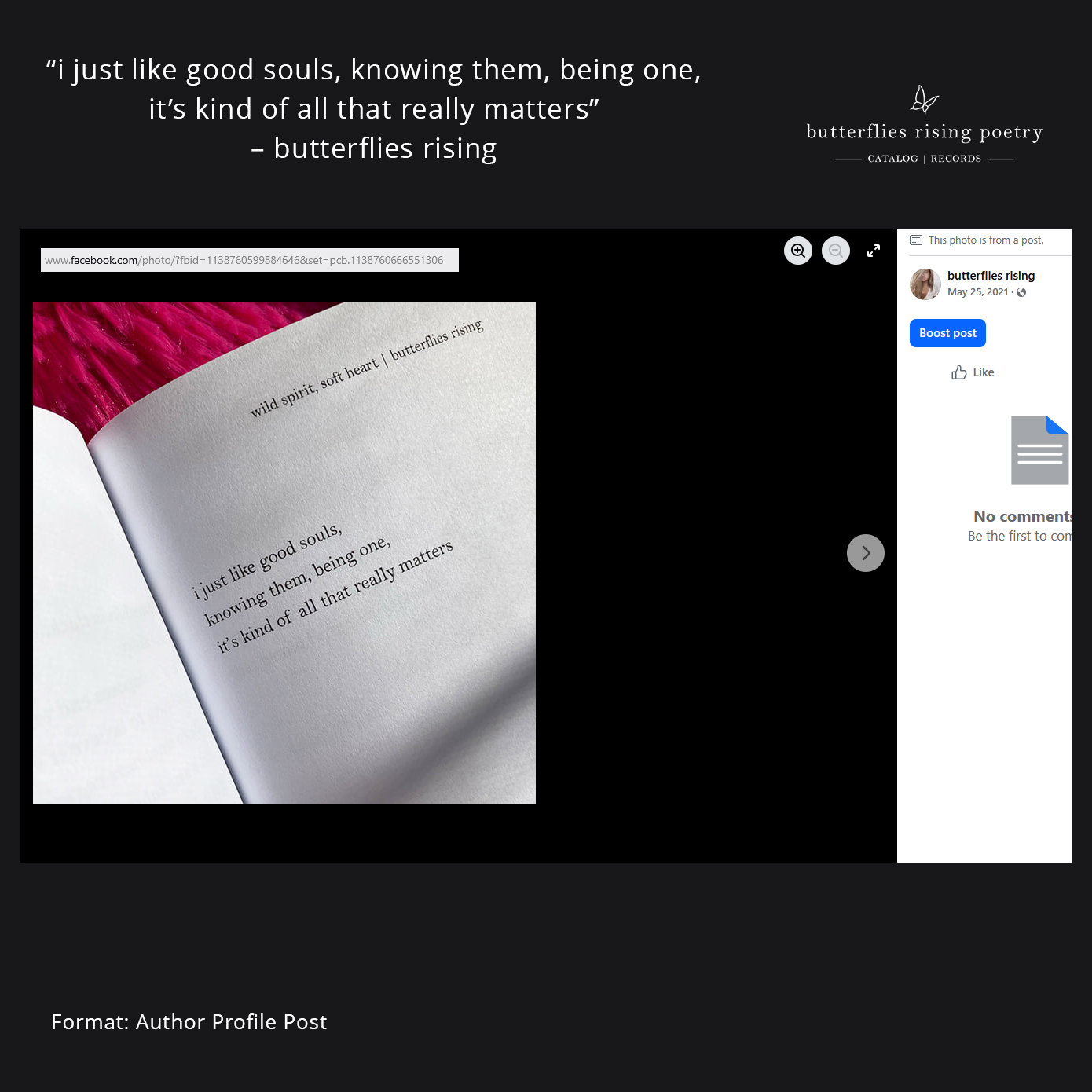 'i just like good souls, knowing them, being one' is a quote by the author butterflies rising that was published publicly on March 10, 2019, and is published in her copyright.gov registered books ‘wild spirit, soft heart’.